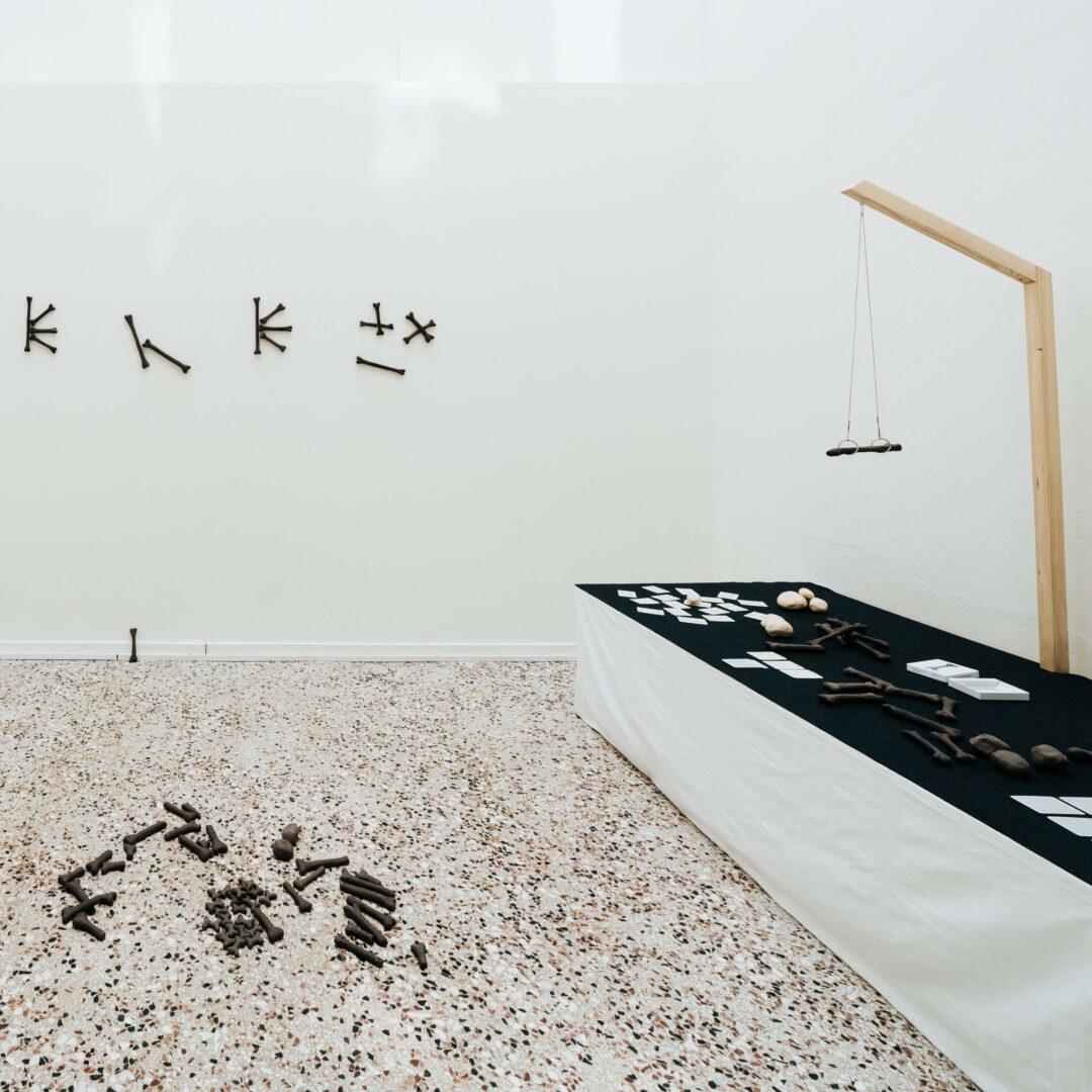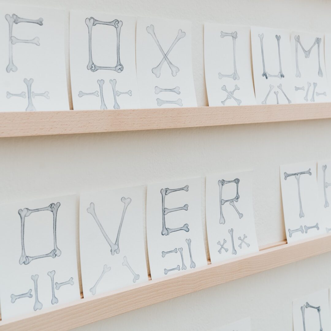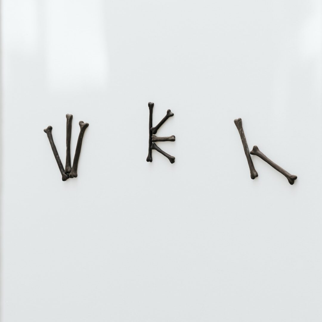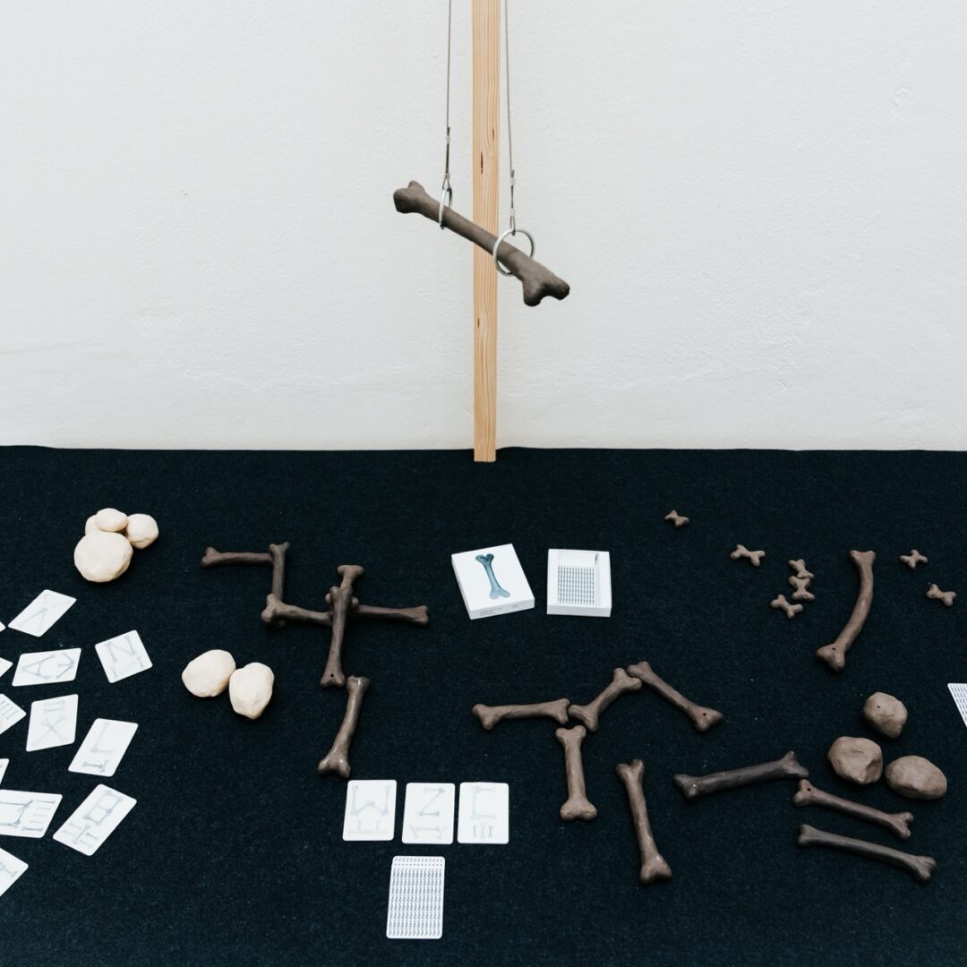 Aware of the performative power of language, Veronika Hauer counters the rhyme’s original intention with an ironic twist. Comic-like, stylized bones, both painterly and sculptural, form an alphabetical system that is inscribed in the exhibition like the “skeleton of language.” Hauer thus begins a coded play with meaning, poetry, sense, and nonsense, which continues in the participatory installation by Veronika Hauer and Australian artist Katie Lee.