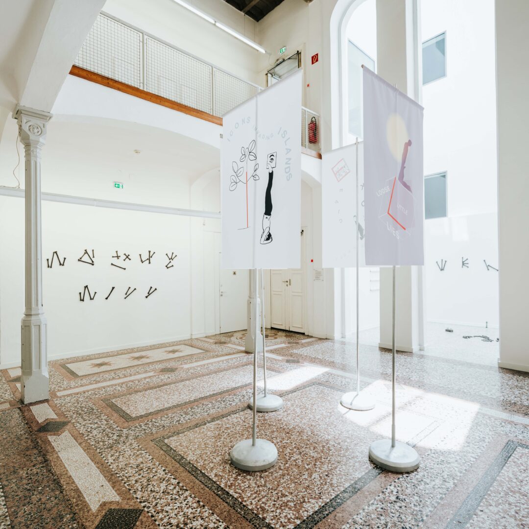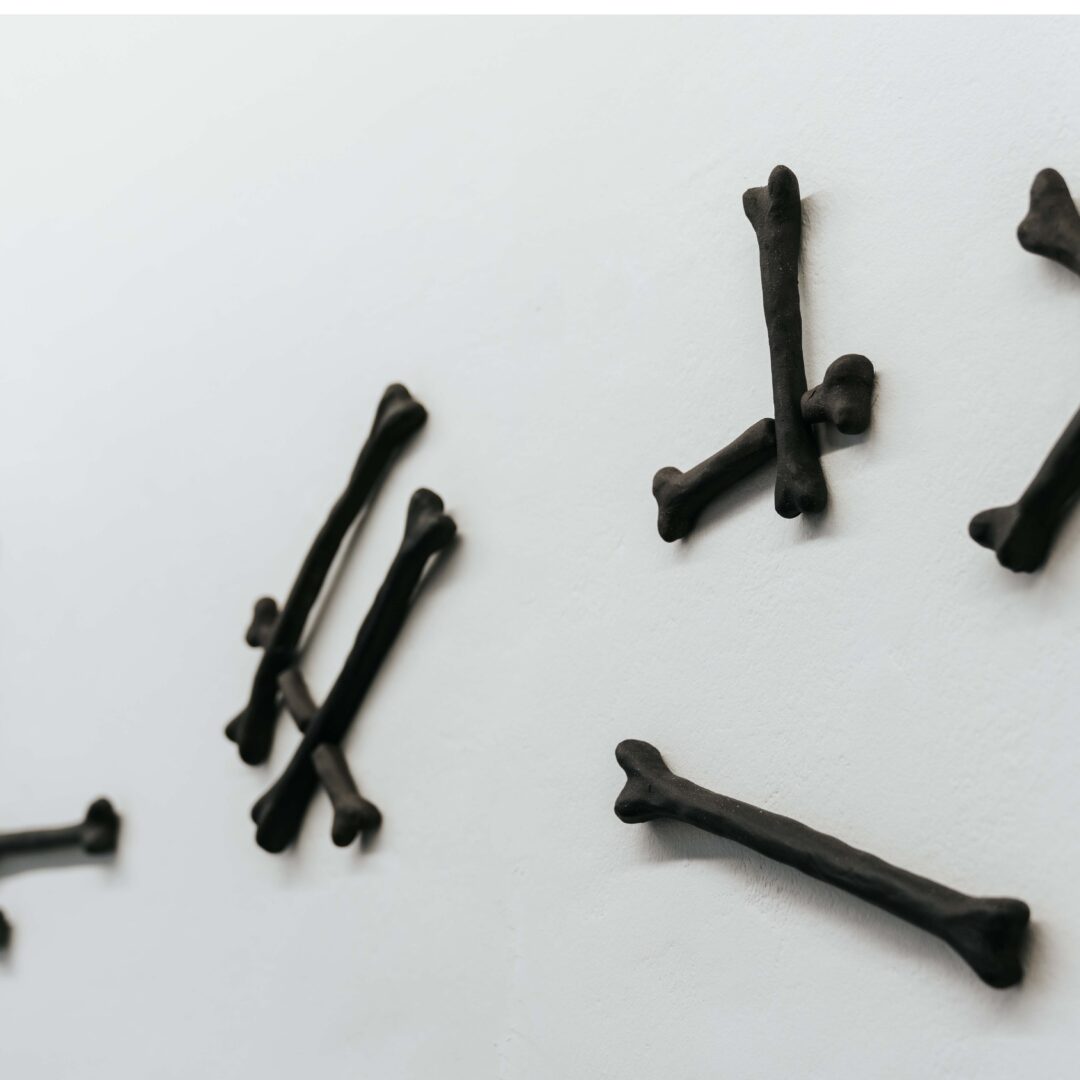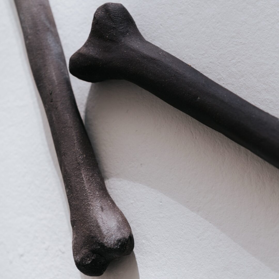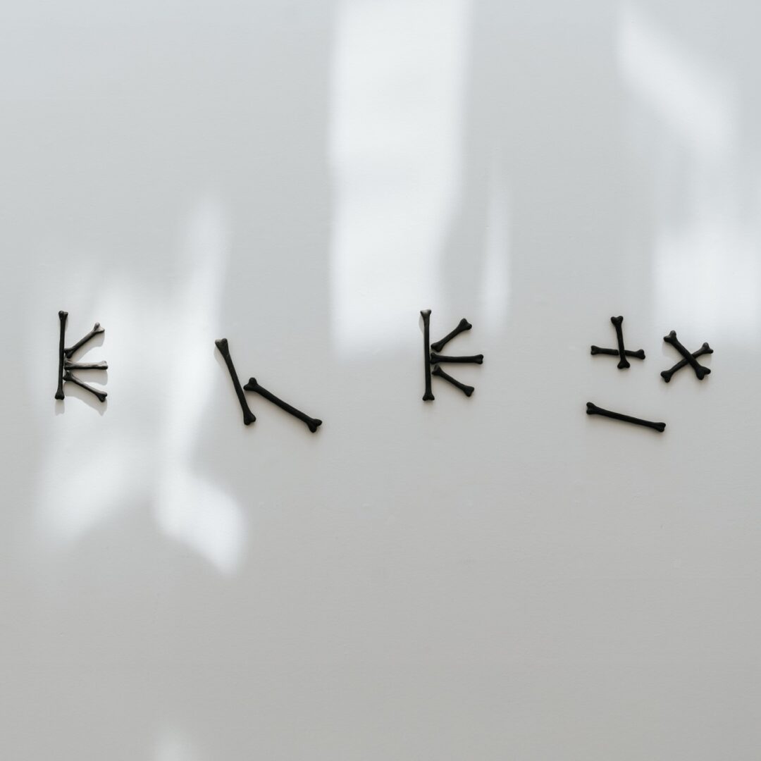 Aware of the performative power of language, Veronika Hauer counters the rhyme’s original intention with an ironic twist. Comic-like, stylized bones, both painterly and sculptural, form an alphabetical system that is inscribed in the exhibition like the “skeleton of language.” Hauer thus begins a coded play with meaning, poetry, sense, and nonsense, which continues in the participatory installation by Veronika Hauer and Australian artist Katie Lee.