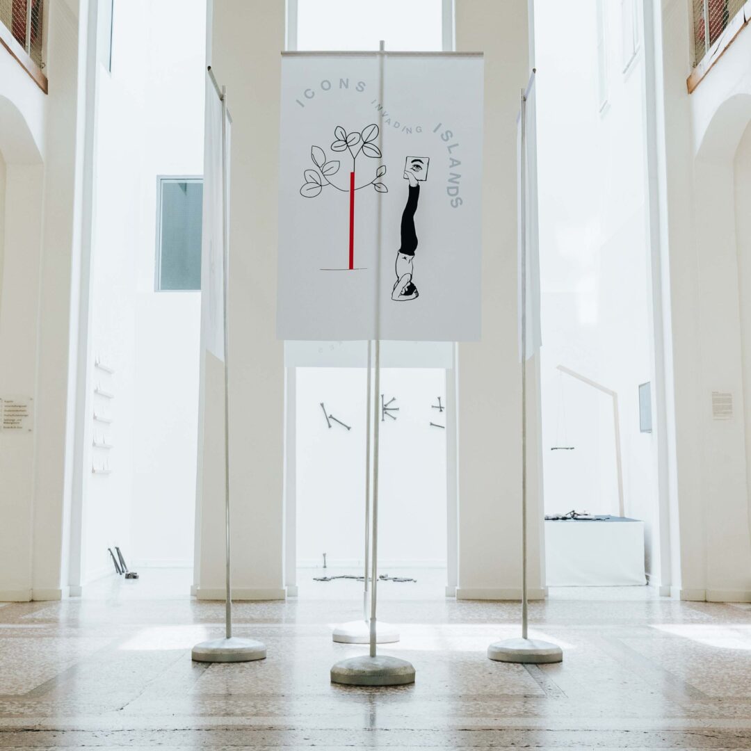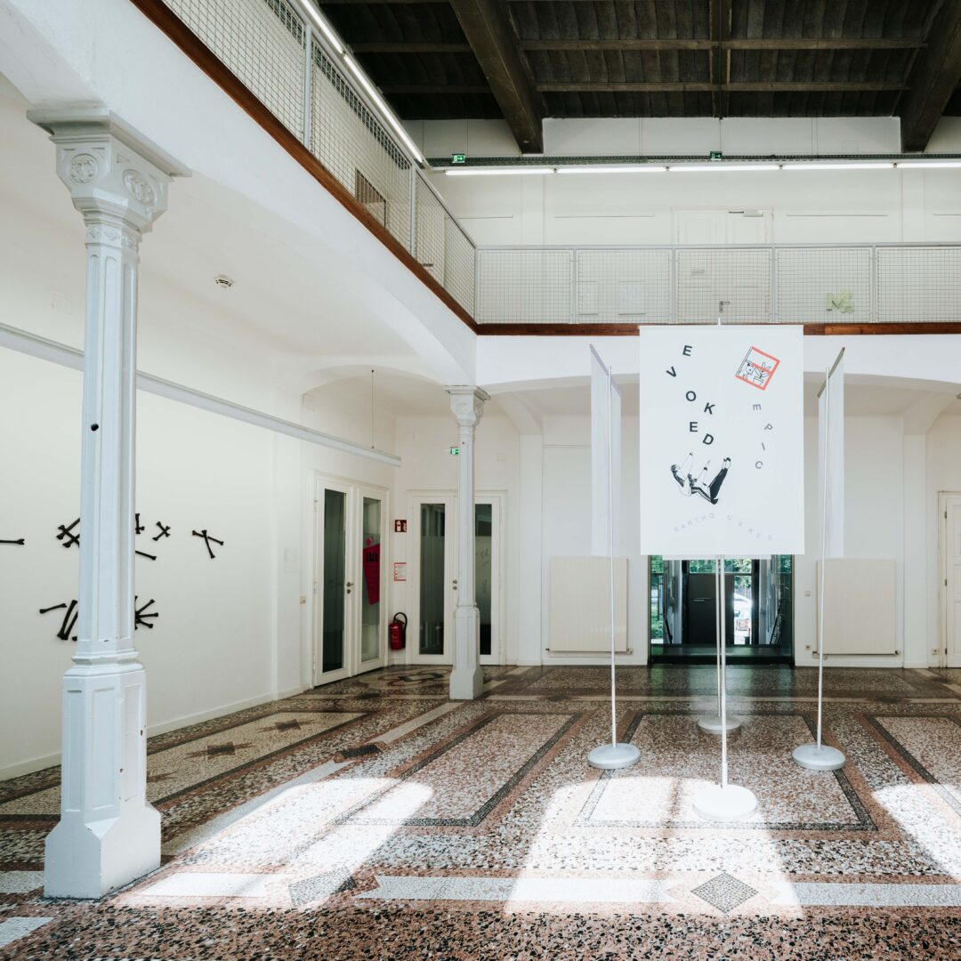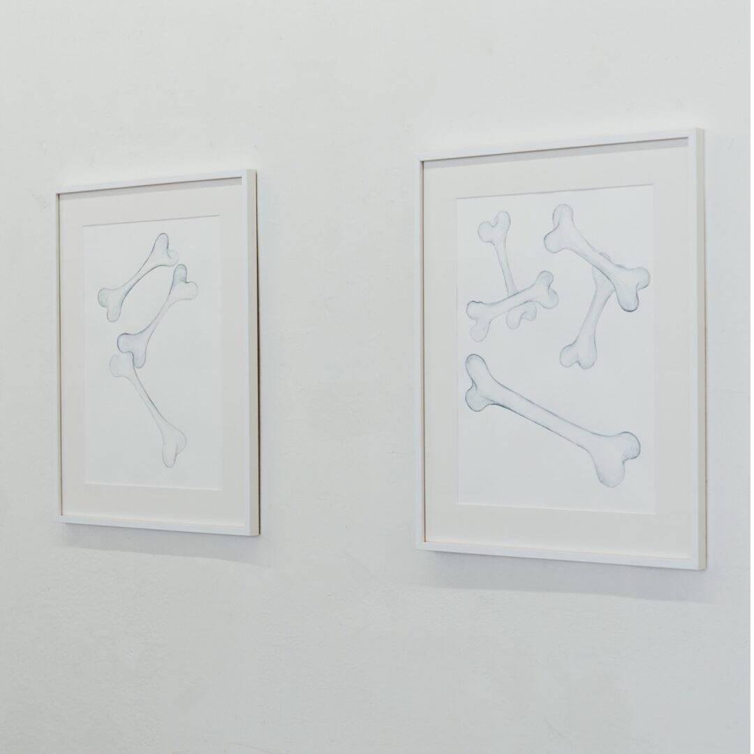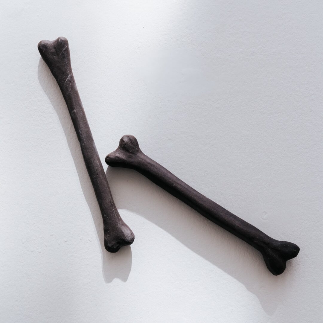 Aware of the performative power of language, Veronika Hauer counters the rhyme’s original intention with an ironic twist. Comic-like, stylized bones, both painterly and sculptural, form an alphabetical system that is inscribed in the exhibition like the “skeleton of language.” Hauer thus begins a coded play with meaning, poetry, sense, and nonsense, which continues in the participatory installation by Veronika Hauer and Australian artist Katie Lee.